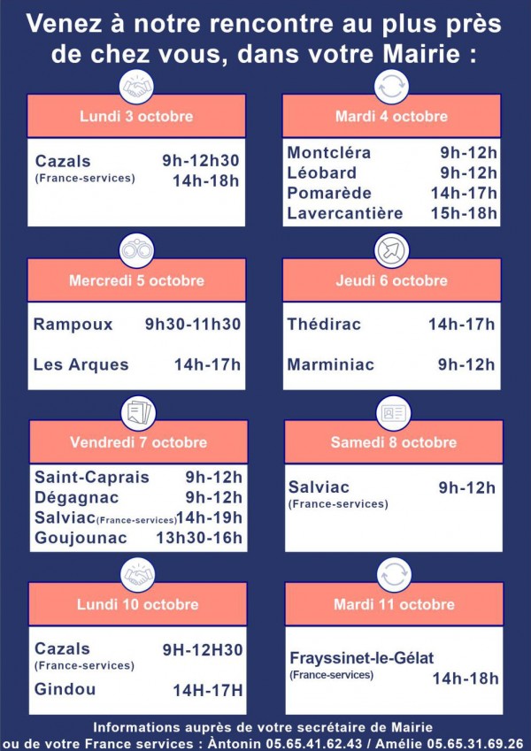 Un animateur de France Service (ancienne Cyberbase) sera à la mairie de Lavercantière ce mardi 4 octobre de 13h à 18h pour vous présenter tous les services qu'il peut vous fournir auprès des administrations :